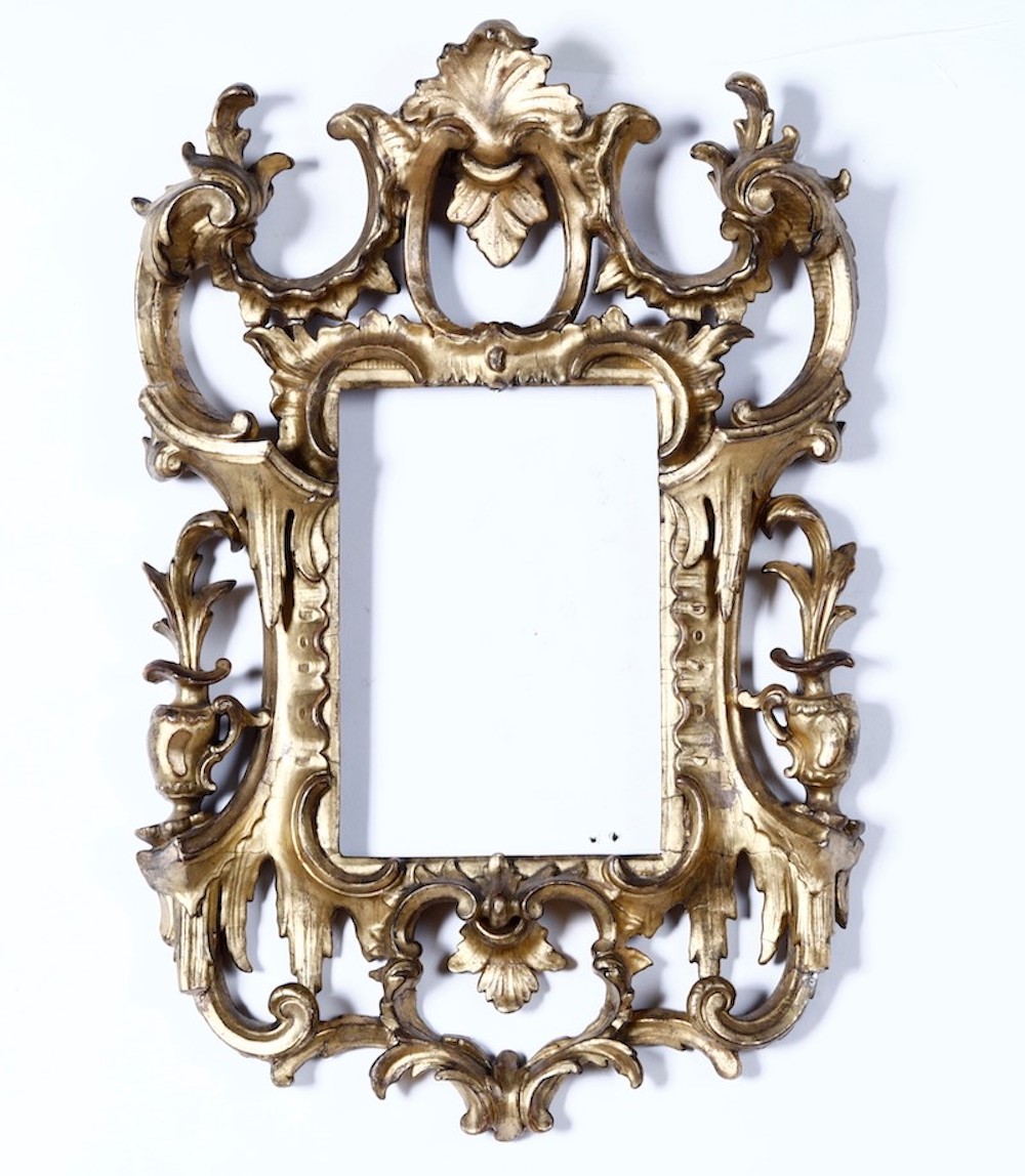 Cornice in legno intagliato e dorato. XVIII secolo, decori intagliati e traforati a motivo di volute ed elementi fogliacei, cm 17,5x12 cm 40x26