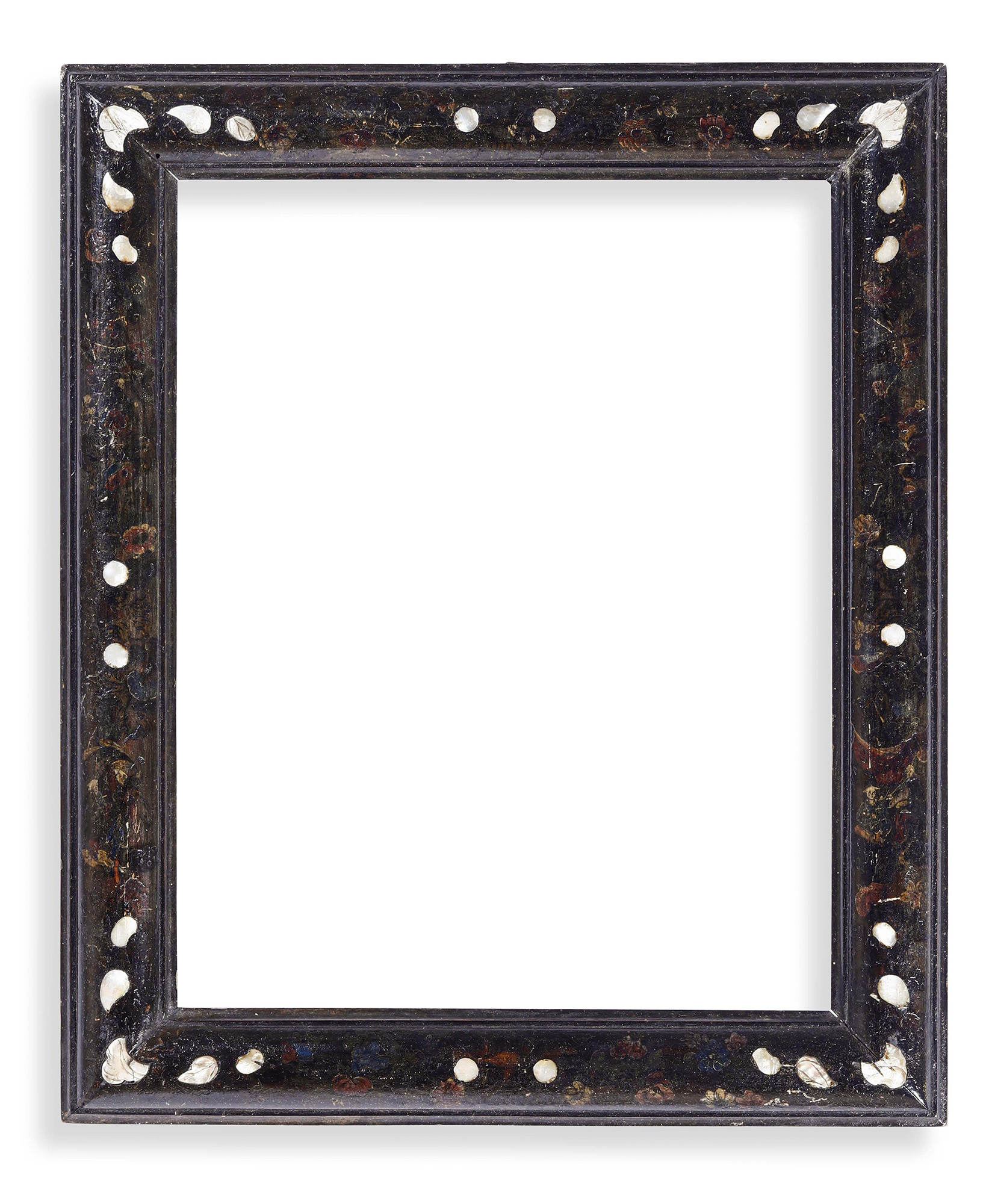 Cornice in legno ebanizzato con madreperla e decorata a cinesini, Venezia XVIII secolo, luce cm 39,5x31, esterno cm. 50,7x42,5