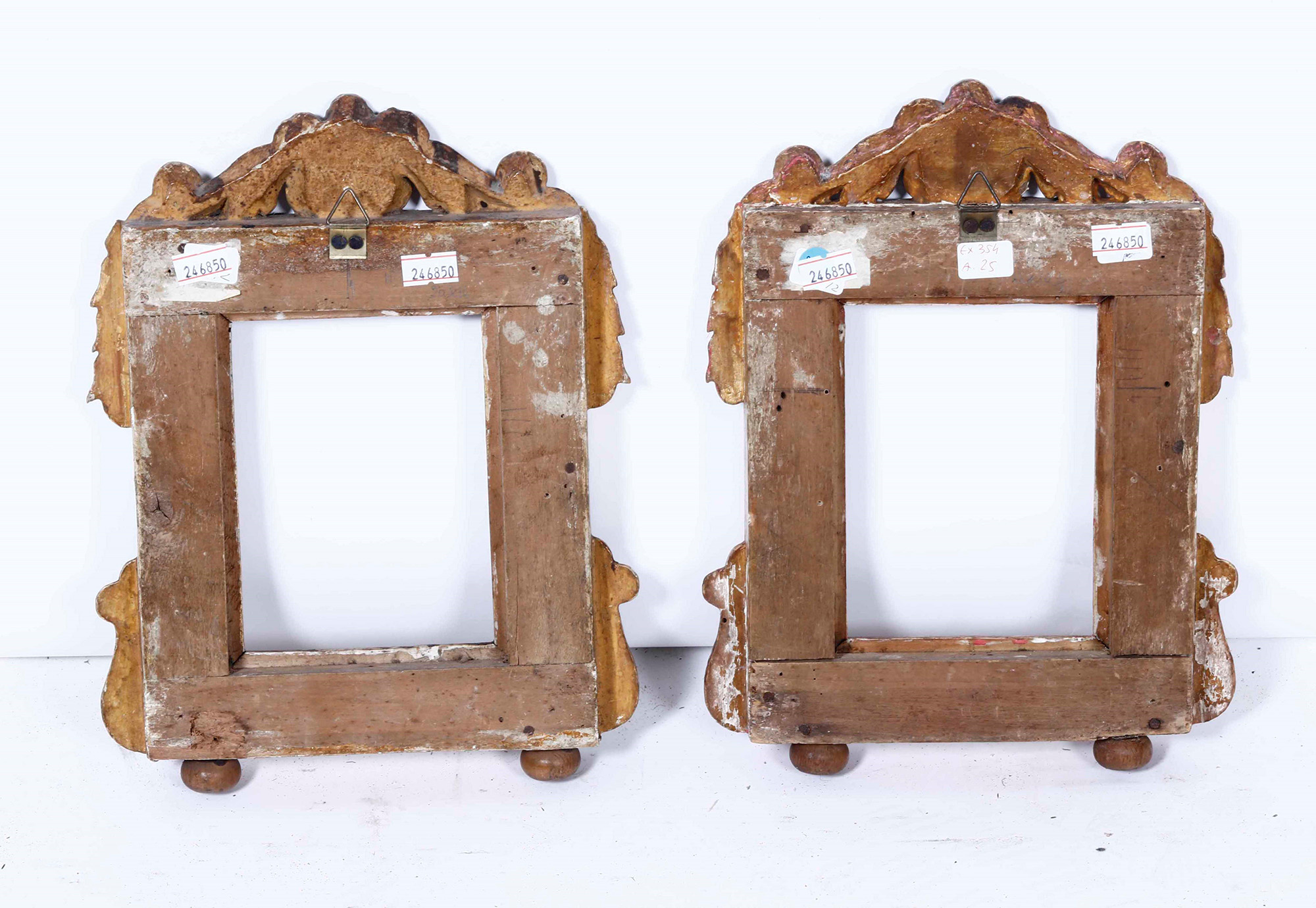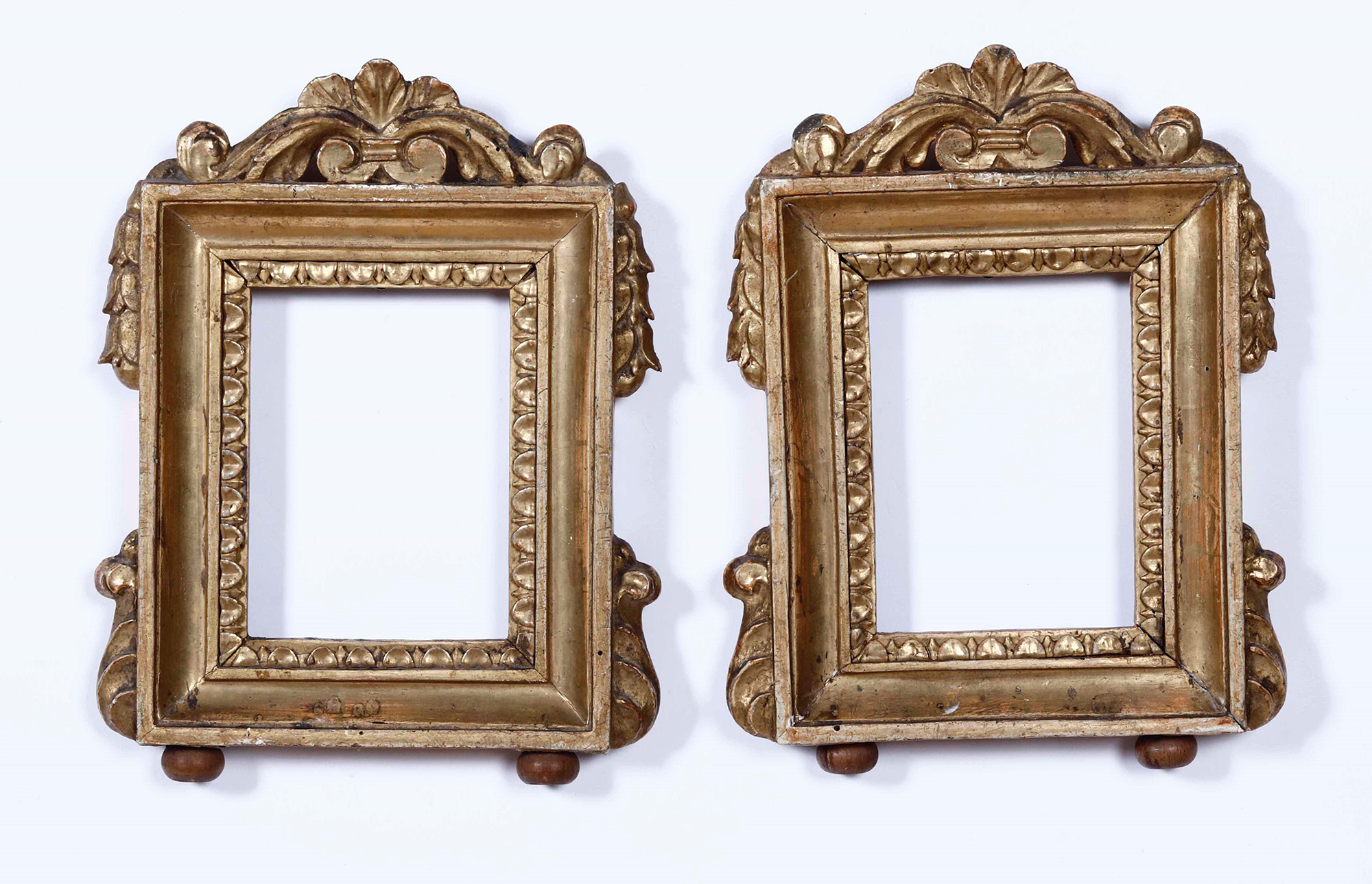 Coppia di piccole cornici in legno dorato e in parte scolpito a motivi fogliati. Napoli, XIX secolo, luce cm. 13,5×10; massimo ingombro cm. 25,5×21