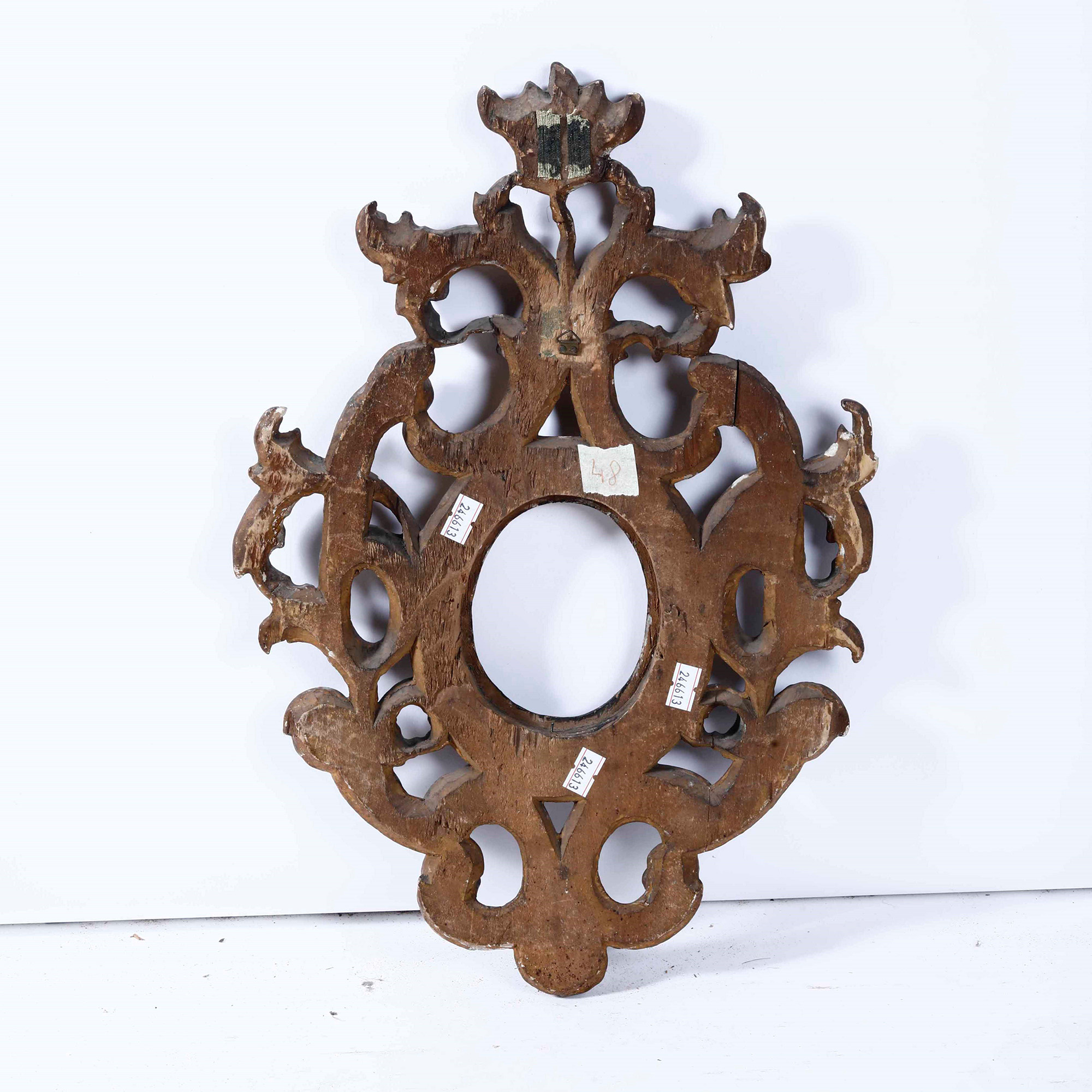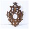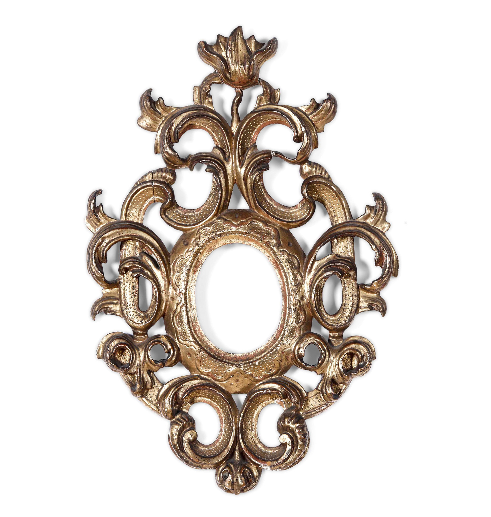 Cornice ovale in legno intagliato, bulinato e dorato. Emilia XVII secolo, mostra ovale con battuta liscia, decori traforati a volute, elementi fogliacei e fiore sulla sommità, cm 43x30 luce cm 10,5x8,5