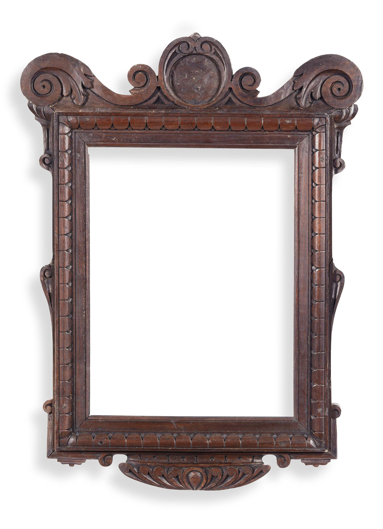 Cornice ad edicola in legno di noce intagliato. Toscana XVIII secolo, cm 75x56 luce cm 44,5x33
