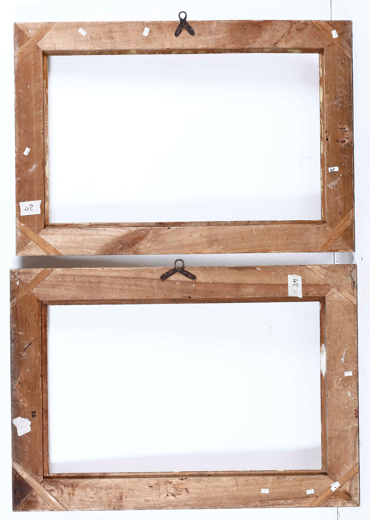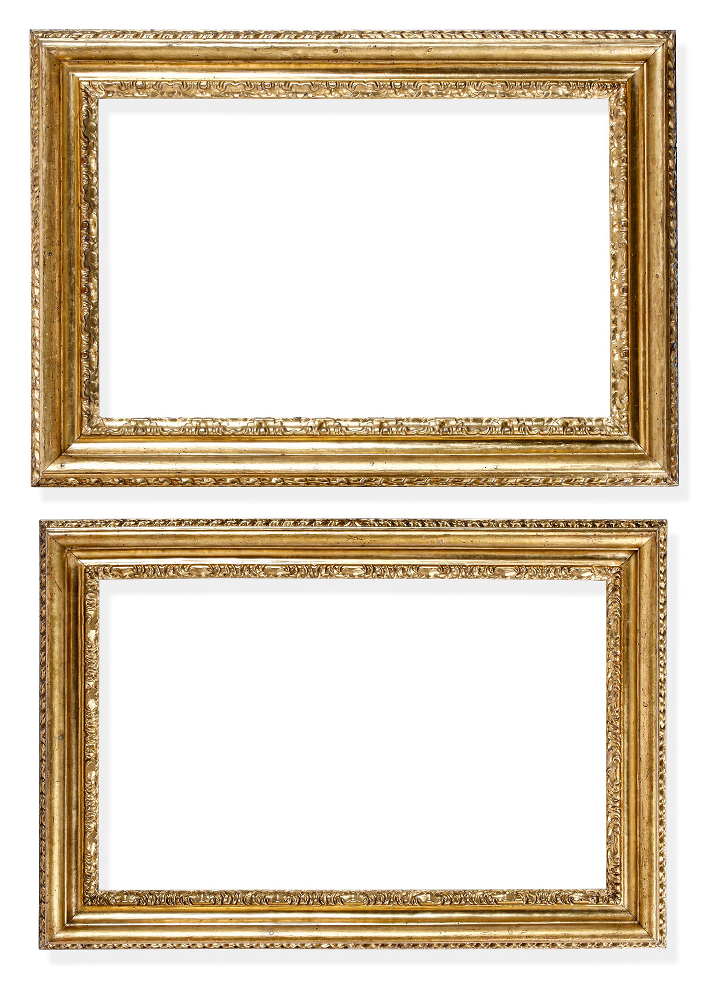 Coppia di cornici in legno intagliato e dorato, Piemonte XVIII secolo, luce cm 77x47,5, esterno cm 96x66