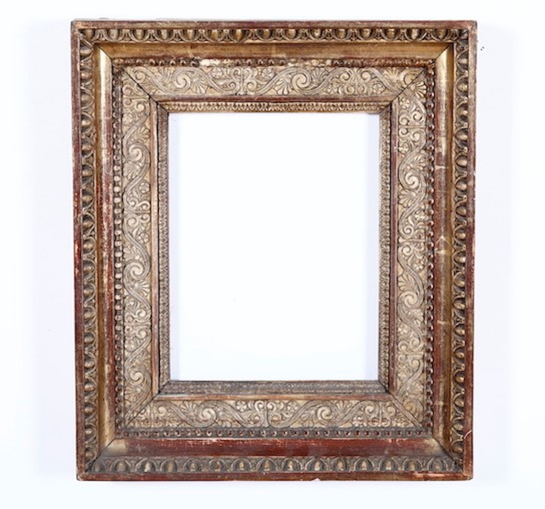 Cornice Impero in legno intagliato e dorato. Inizio XIX secolo, battuta intagliata a foglie lanceolate, fascia riccamente intagliata a volute, foglie e fiori con cornice perlinata; profilo esterno baccellato, cm 27x21 (luce)