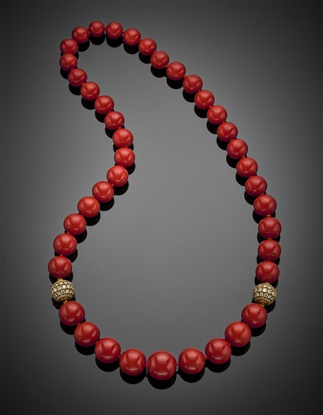 Red coral graduated bead necklace with two yellow gold diamond bead clasps, bead diam. from mm 10 to mm 16 circa, g 128.64 circa, length cm 56 circa.