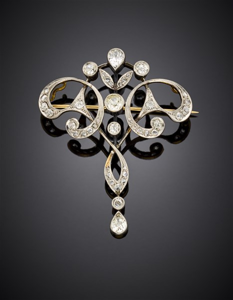 Spilla/centrale a volute in oro giallo e platino con diamanti old mine, a goccia e a mezza rosetta per complessivi ct. 2,00 circa, i diamanti principali di ct. 0,35, ct. 0,38 e ct. 0,38 circa, g 14,99 circa, lungh. cm 5,80 circa. In scatola originale Pasquale Pisano e figli, accompagnato da nota manoscritta
