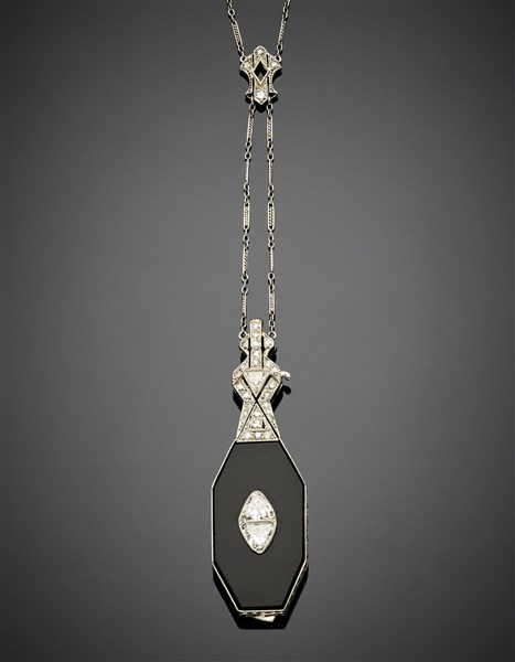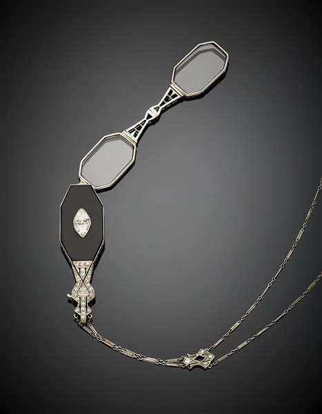 Lorgnette in platino, onice e diamanti per complessivi ct. 1,60 circa con sautoir di cm 70 circa, i diamanti triangolari di ct. 0,65 circa e di ct. 0,50 circa circa, g 25,26 circa. Numerato. (lievi difetti)