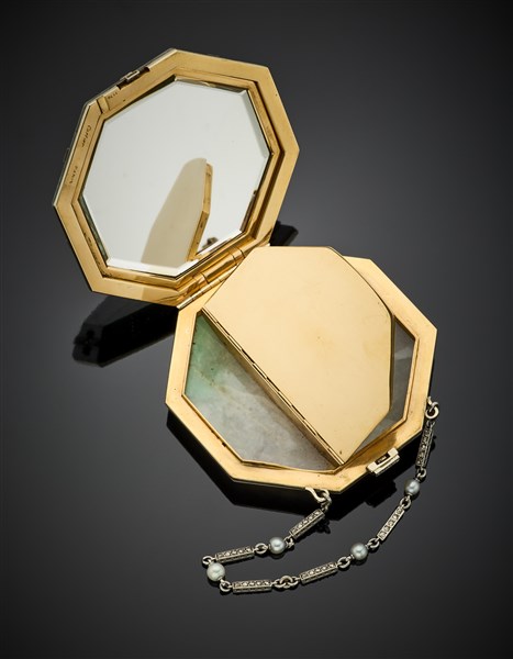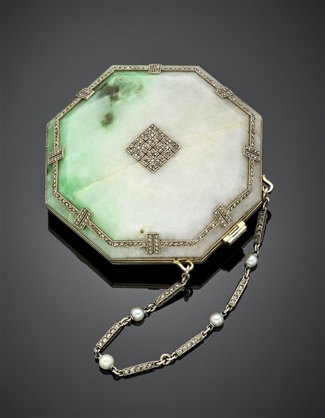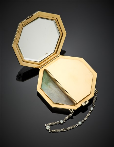 Octagonal powder compact in carved jadeite finished in yellow gold, platinum and rose cut diamonds with a cm 13 circa platinum chain with pearls and rose cut diamonds, mirror inside, gross g 114.40 circa, length cm 6.30 circa. Signed Cartier Paris, n° 1170, French goldsmith and assay marks. (slight defects)