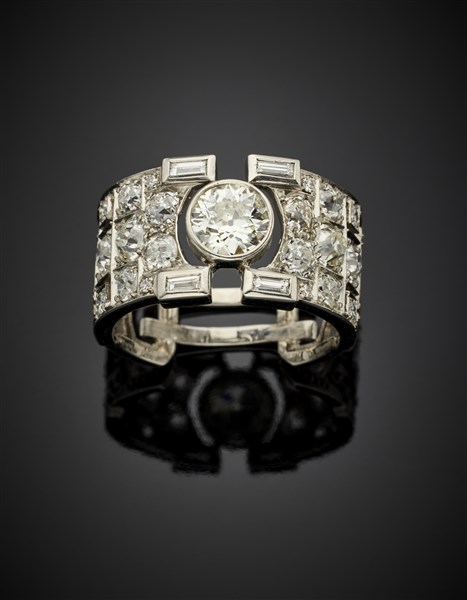 Anello a fascia in platino, diamanti old mine e baguette per complessivi ct. 1,95 circa, al centro un diamante old mine di ct. 0,80 circa, g 8,30 circa misura 17/57.