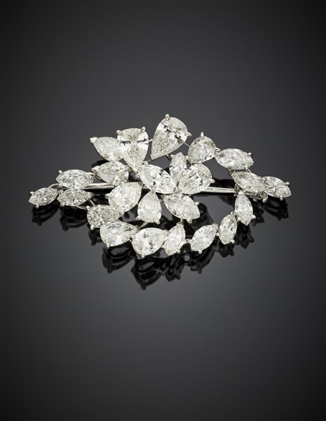 Broche in oro bianco con diamanti a goccia e navette per complessivi ct. 6,50 circa, g 10,28 circa, lungh. cm 4,40 circa. In scatola Pederzani