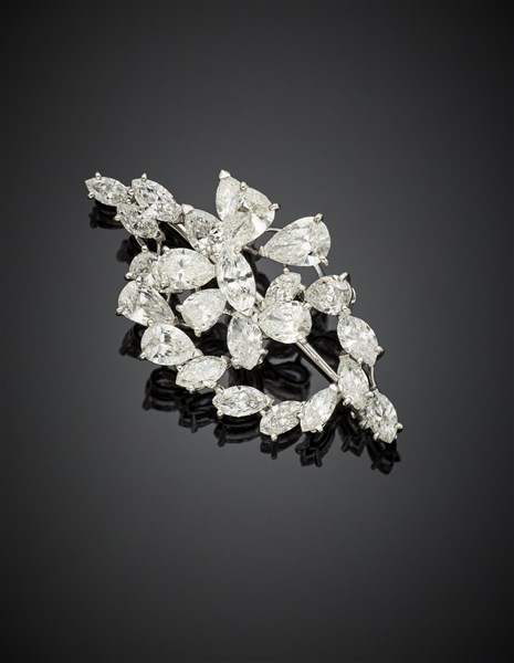 Broche in oro bianco con diamanti a goccia e navette per complessivi ct. 6,50 c