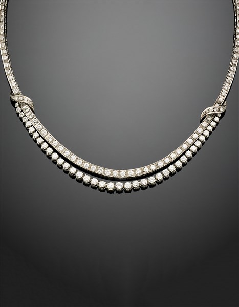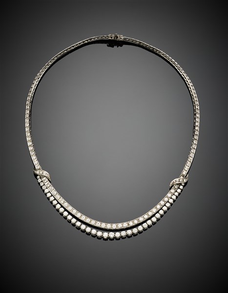Collier in platino a festone centrale con diamanti rotondi taglio a brillante per complessivi ct. 9,00 circa, g 41,80 circa, lungh. cm 41 circa.