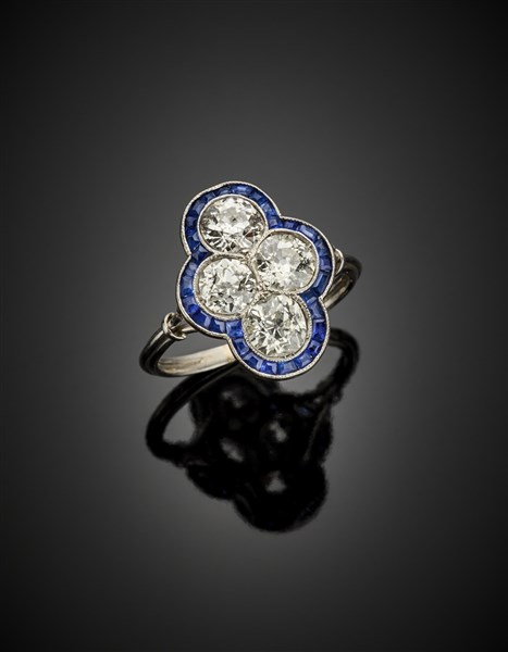 Anello in platino con quattro diamanti old mine per complessivi ct. 2,25 circa e zaffiri calibré a rifinirli, g 4,20 circa misura 16/56. Marchi francesi di assaggio e dell'orefice.