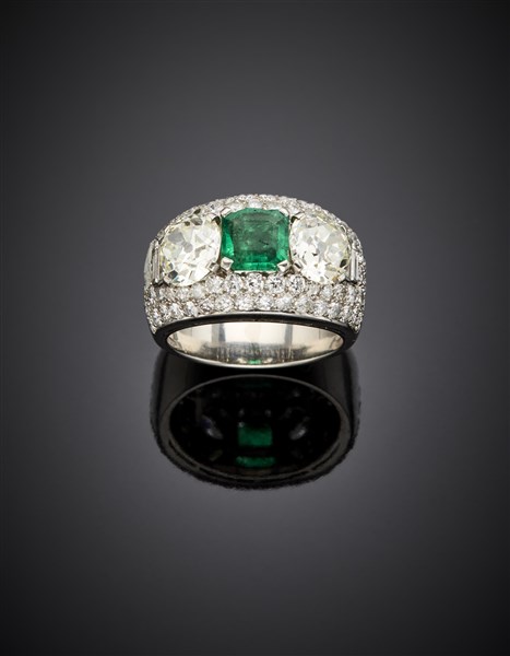 Anello in platino con due diamanti rotondi e uno smeraldo a gradini di ct. 1,30 circa rifinito con diamanti a pavé e piccole baguette, diamanti per complessivi ct. 5,10 circa, g 13,90 circa. Firmato Bulgari. Con scatola originale