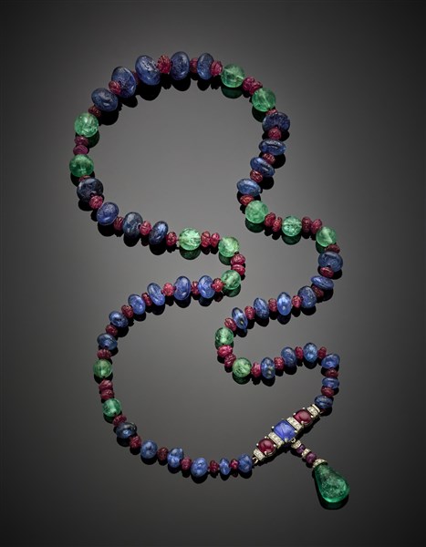 Collana a scalare tipo "tuttifrutti" in zaffiri, rubini e smeraldi a boule e scolpiti con chiusura in platino, oro bianco, diamanti, rubini e zaffiri a tenere una boule di smeraldo di mm 15,5x11,0 circa, g 76,96 circa, lungh. cm 63 circa. In scatola originale
