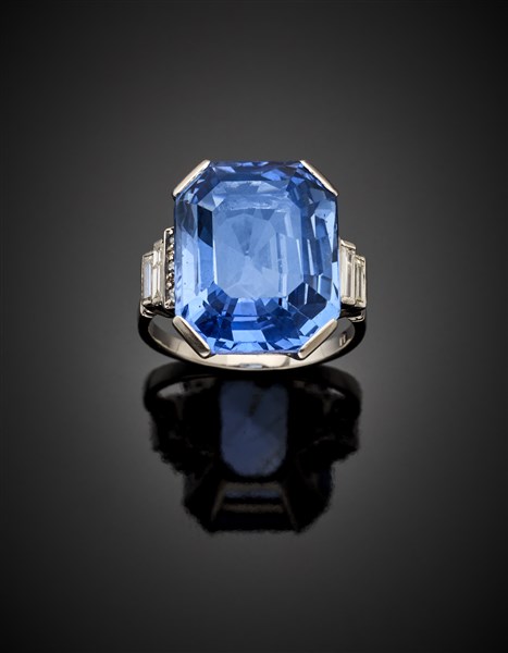 Lot 80 | Anello in platino con zaffiro ottagonale di ct. 19,50 circa e diamanti rotondi
