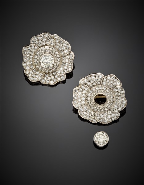 Orecchini a fiore in oro bianco e diamanti a pavé, al centro un diamante di ct. 0,90 circa e di ct. 1,00 circa smontabili, diamanti per complessivi ct. 4,20 circa, g 18,70 circa, diam. cm 2,60 circa. Firmati Tiffany & Co.