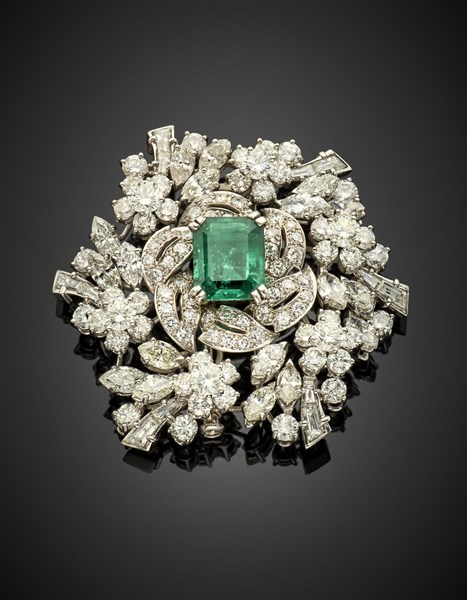 Spilla in oro bianco con diamanti rotondi, marquise e baguette a contornare uno smeraldo ottagonale di ct. 3,80 circa, diamanti per complessivi ct. 12,50 circa, g 26,74 circa, lungh. cm 4,80 circa.