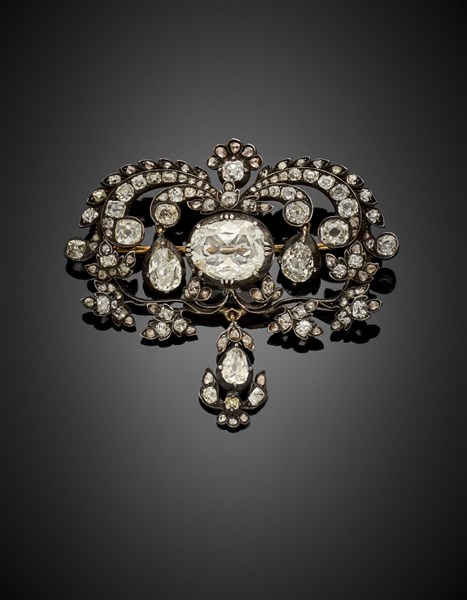 Lot 93 | Spilla a volute in oro, argento e diamanti old mine per complessivi ct. 4,30 ci