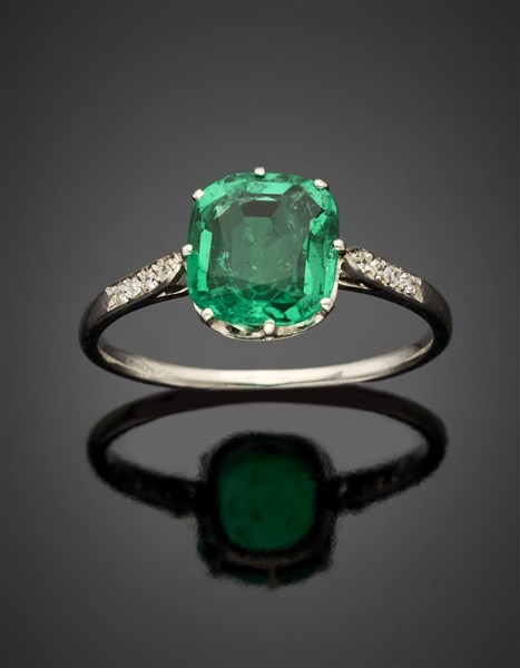 Anello in platino con smeraldo a cuscino di ct. 1,31 e piccoli diamanti a mezza rosetta, g 1,88 circa. Marchi francesi di assaggio e dell'orefice. In scatola originale