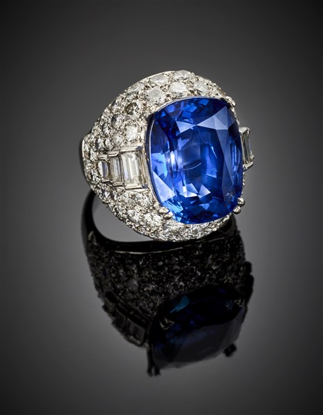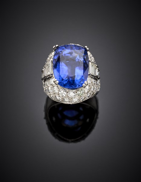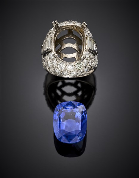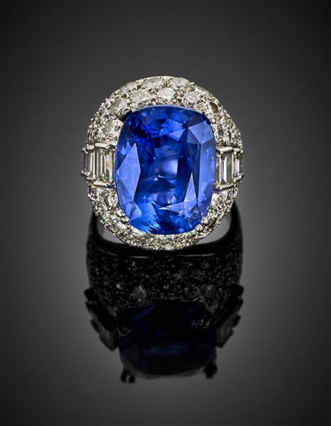Oval ct. 16.24 sapphire with tapering round and baguette diamond pavé white gold ring, g 19.41 circa size 12/52.
