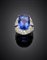 Anello in oro bianco con pavè di diamanti tondi e baguette a scalare e zaffiro ovale di ct. 16,24, g 19,41 circa misura 12/52.