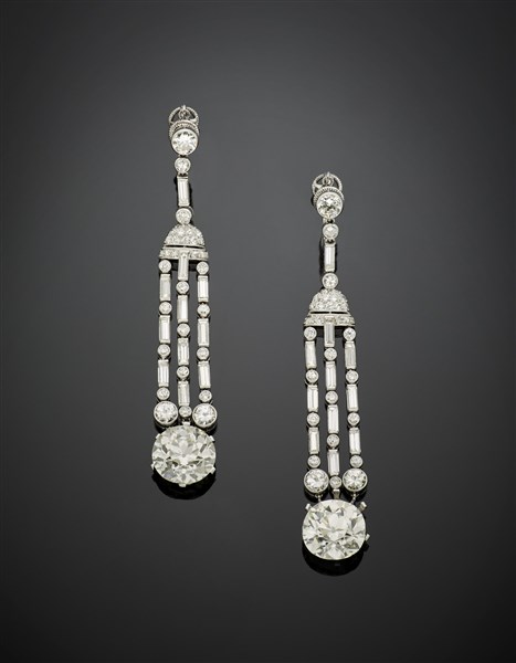 Orecchini pendenti articolati in platino e oro bianco con diamanti rotondi e baguette a tenere due diamanti rotondi di ct. 4,89 e di ct. 4,72, per complessivi ct. 12,90 circa, g 17,75 circa, lungh. cm 6,50 circa.