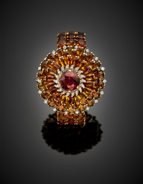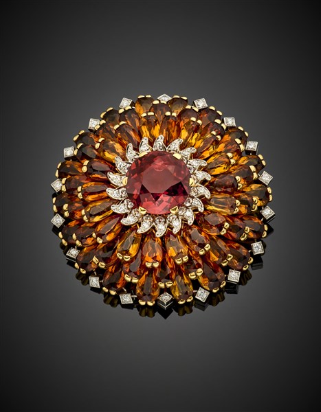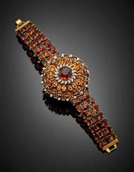 Bracciale in oro giallo 750/1000, 585/1000 e quarzi citrini ovali con un centrale a fiore staccabile e utilizzabile come broche a tre ordini di petali mobili in quarzi e diamanti, g 92,86 circa, lungh. cm 16,80 circa. Firmato Cartier London.