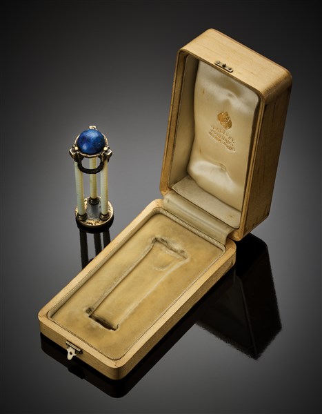 Porta sigillo in argento e smalto guilloché bianco crema formato da tre colonne festonate e globo in pietra dura, g 44,75 circa, lungh. cm 7,20 circa. Reca la firma Fabergé in cirillico, il marchio di August Hollming AH e marchi russi di stato per l'argento con iniziali dell'assaggiatore Iakov Liapunov in vigore tra il 1899 e il 1904, titolo dell'argento 84 zolotnik**, marchi francesi di importazione