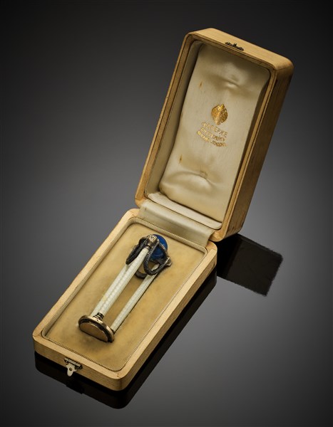 Silver and white guilloché enamel seal formed by three festooned columns and hard stone blue globe, g 44.75 circa, length cm 7.20 circa. Bearing the signature Fabergé in Cyrillic, the mark AH for August Hollming, russian hallmarks for silver with the assaymaster Iakov Liapunov initials in use in San Pietroburgo between 1899 and 1904, 84 zolotniks** silver, French import marks. In a refitted Fabergé wooden case