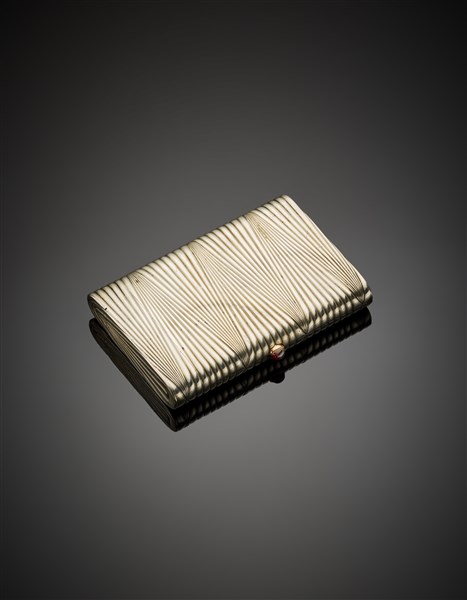 Silver grooved cigarette case with vesta compartment, cabochon red glass paste on the thumbpiece, cm 9.6x6.5x1.3 circa, gilt silver details, g 143.43 circa. Signed Fabergé in Cyrillic, marked AH for August Hollming, Russian hallmarks for silver with the assaymaster Iakov Liapunov initials in use in San Pietroburgo between 1899 and 1904, 88 zolotniks silver, inventory n° 8143 and french import hallmarks. (defects)
