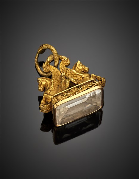 Yellow gold hyaline quartz pendant/seal formed by two sea monsters, half winged horses and half dolphins, over a frieze with shells and tridents, cm 5x2.9x2.4 circa, g 33.62 circa. French hallmark.