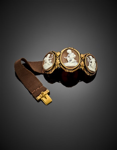 Grosgrain bracelet composed of a yellow gold element with three cm 6.3 circa cameos depicting classical subjects and a gold clasp, gross g 32.30 circa, length cm 16 circa.