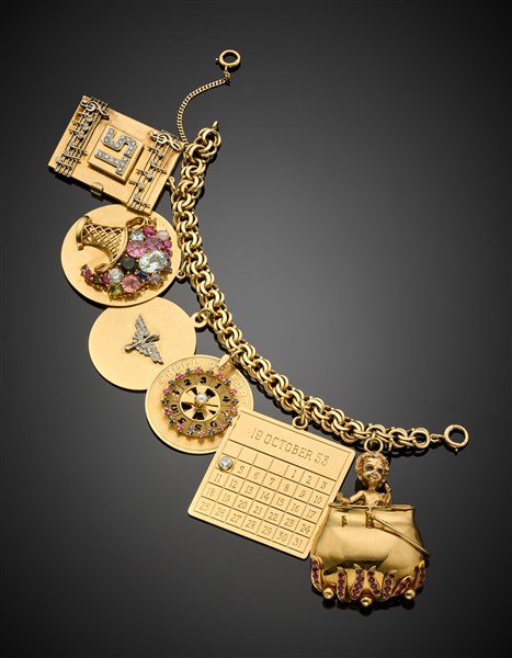 Bracciale appartenuto a Sophie Tucker a catena in oro giallo 585/1000 con sei grandi charms di diverse fogge e rifiniti con pietre varie, tutti con dediche a Sophie Tucker The Last of the Red Hot Mamas, g 202,50 circa, lungh. cm 19,50 circa.