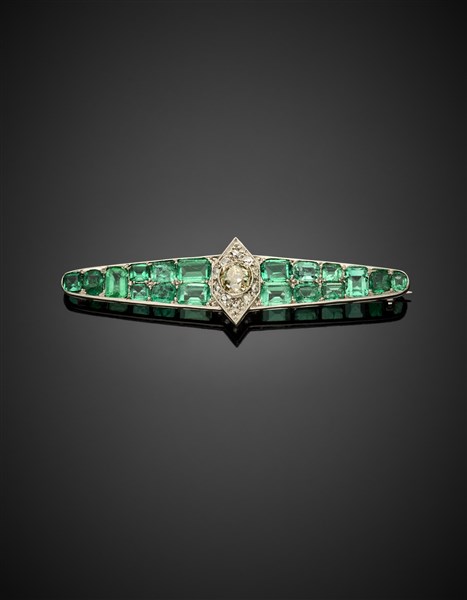 Spilla a barretta in platino con smeraldi ottagonali, carré e a cuscino e rifinita con un motivo esagonale in diamanti, il diamante old mine centrale di ct. 0,50 circa, g 5,84 circa, lungh. cm 5,30 circa. In scatola originale (lievi difetti)