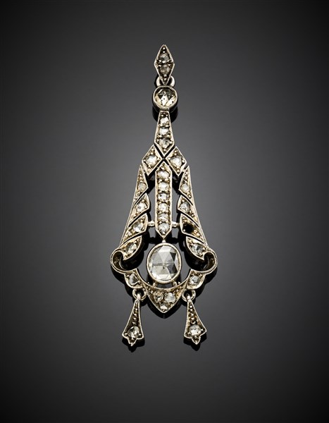 Rose cut diamond white gold pendant, main diamond ct. 0.30 circa, g 5.75 circa, length cm 5.60 circa. (losses)