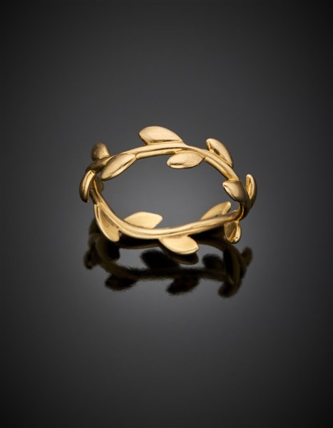 Anello in oro giallo con piccole foglie, g 3,00 circa misura 14/54. Firmato Paloma Picasso in corsivo, T & Co. In scatola originale