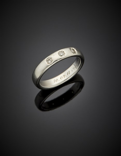 Platinum three diamond wedding band in all ct. 0.15 circa, inside inscription, g 7.71 circa size 13/53. Signed Tiffany & Co., pat. 5970744.
