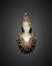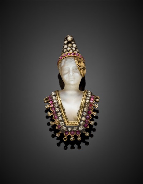 Spilla in oro giallo e argento con diamanti a mezza rosetta, rubini e quarzo ialino scolpito a guisa di giovane, g 9,15 circa, lungh. cm 3,90 circa.