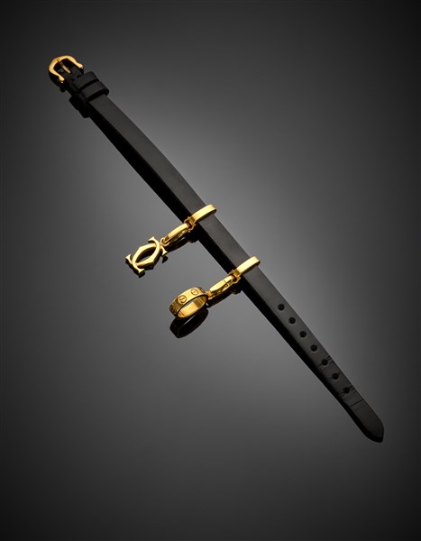 Leather bracelet with a "Love" and crossed "C" charm, yellow gold clasp, gross g 11.44 circa, length cm 18 circa. All parts signed Cartier, one charm marked GP 3896, the other GB0583, clasp marked Swiss made. In Cartier case