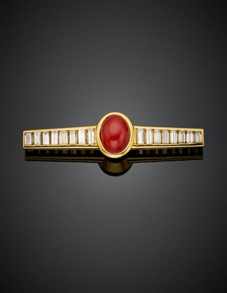Spilla in oro giallo con diamanti a baguette e corallo rosso cabochon, diamanti per complessivi ct. 1,50 circa, g 6,94 circa, lungh. cm 4,30 circa. Marcata 20 MI. In scatola originale Cusi