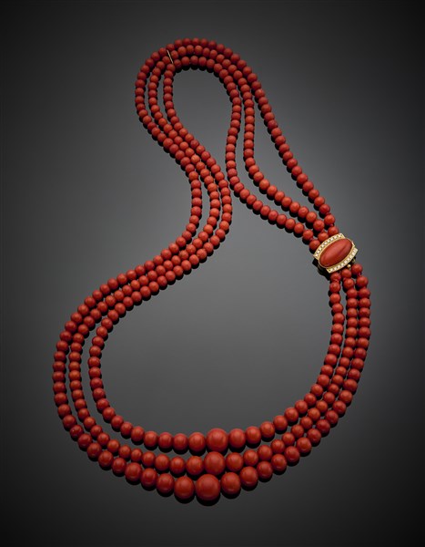 Collana a tre fili di boules in corallo rosso arancione a scalare da mm 5,00 a mm 11,50 circa, chiusura in oro giallo con corallo ovale cabochon, un distanziatore in oro, g 85,90 circa, lungh. cm 52,80 circa.