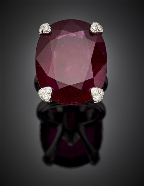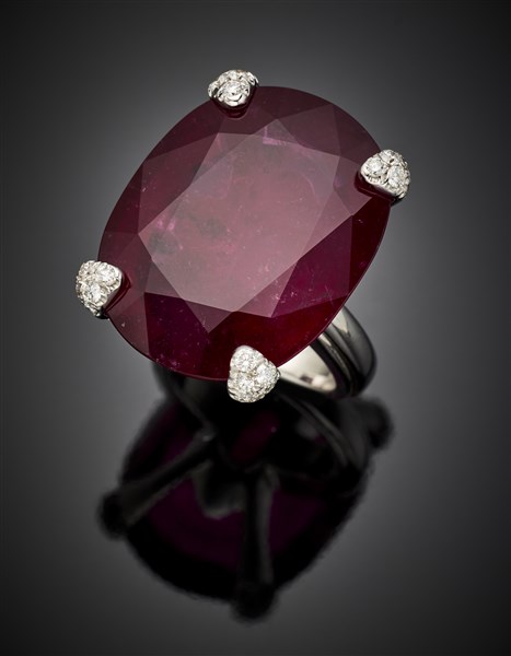 Anello in oro bianco con grande tormalina taglio a cuscino rifinita con piccoli diamanti, g 23,89 circa misura 14/54. In scatola