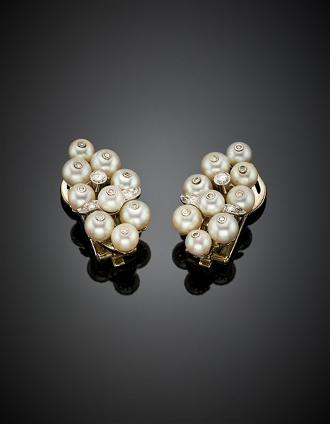 White gold diamond and pearl earclips, g 15.22 circa, length cm 2.70 circa.