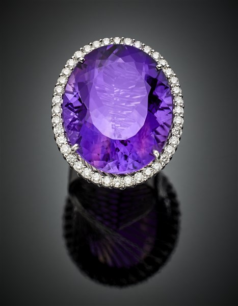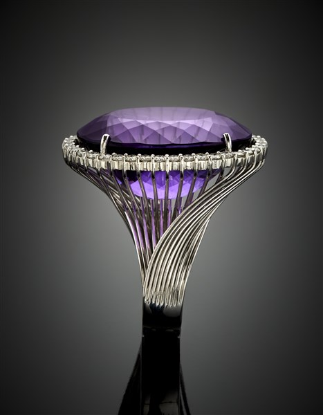 Anello in oro bianco con ametista ovale di ct. 8,87 circa e diamanti per complessivi ct. 1,36 circa a rifinirla, g 22,17 circa misura 14/54. Marchi italiani, logo MV 1947.