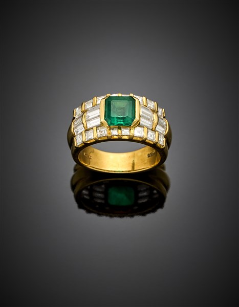 Anello in oro giallo con smeraldo ottagonale di ct. 1,45 circa e diamanti baguette e carré per complessivi ct. 2,00 circa, g 10,73 circa misura 13/53.