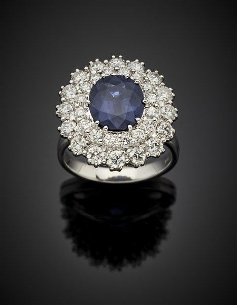 Anello in oro bianco con zaffiro ovale di ct. 2,45 circa e diamanti rotondi per complessivi ct. 1,70 circa, g 7,45 circa misura 11/51.