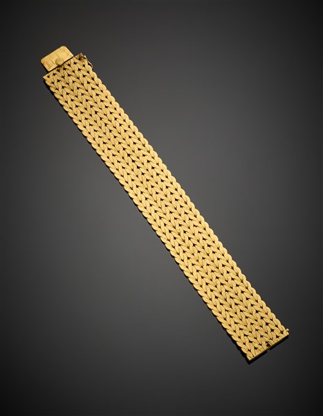 Bracciale in oro giallo a maglia intrecciata piatta e satinata, g 84,77 circa,