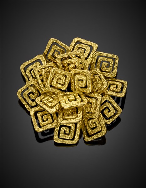Spilla in oro giallo martellato, g 31,86 circa, diam. cm 4,60 circa. Firmata Pomellato, 469 MI.