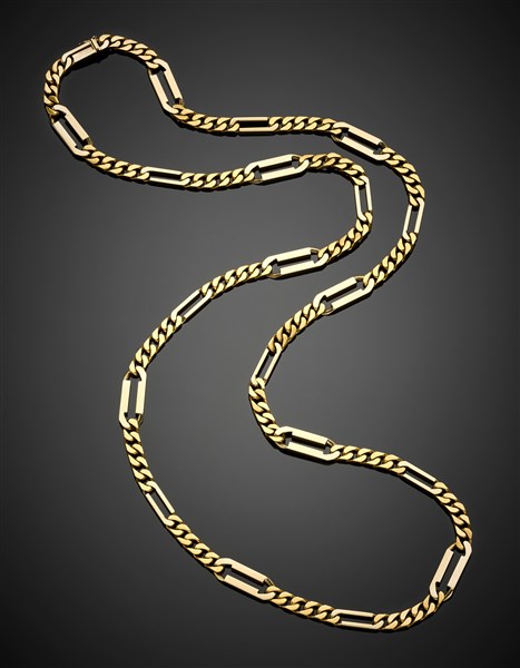 Collier a catena in oro giallo e bianco maglia groumette con distanziatori a losanga, g 95,60 circa, lungh. cm 81 circa. Firmato e marcato Weingrill, WC, 15VR.