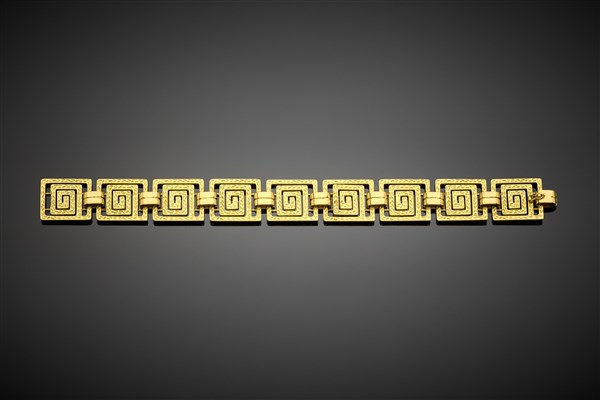 Bracciale modulare in oro giallo martellato, g 55,67 circa, lungh. cm 20,20 circa. Marcato con "testa di cavallo", 469 MI.